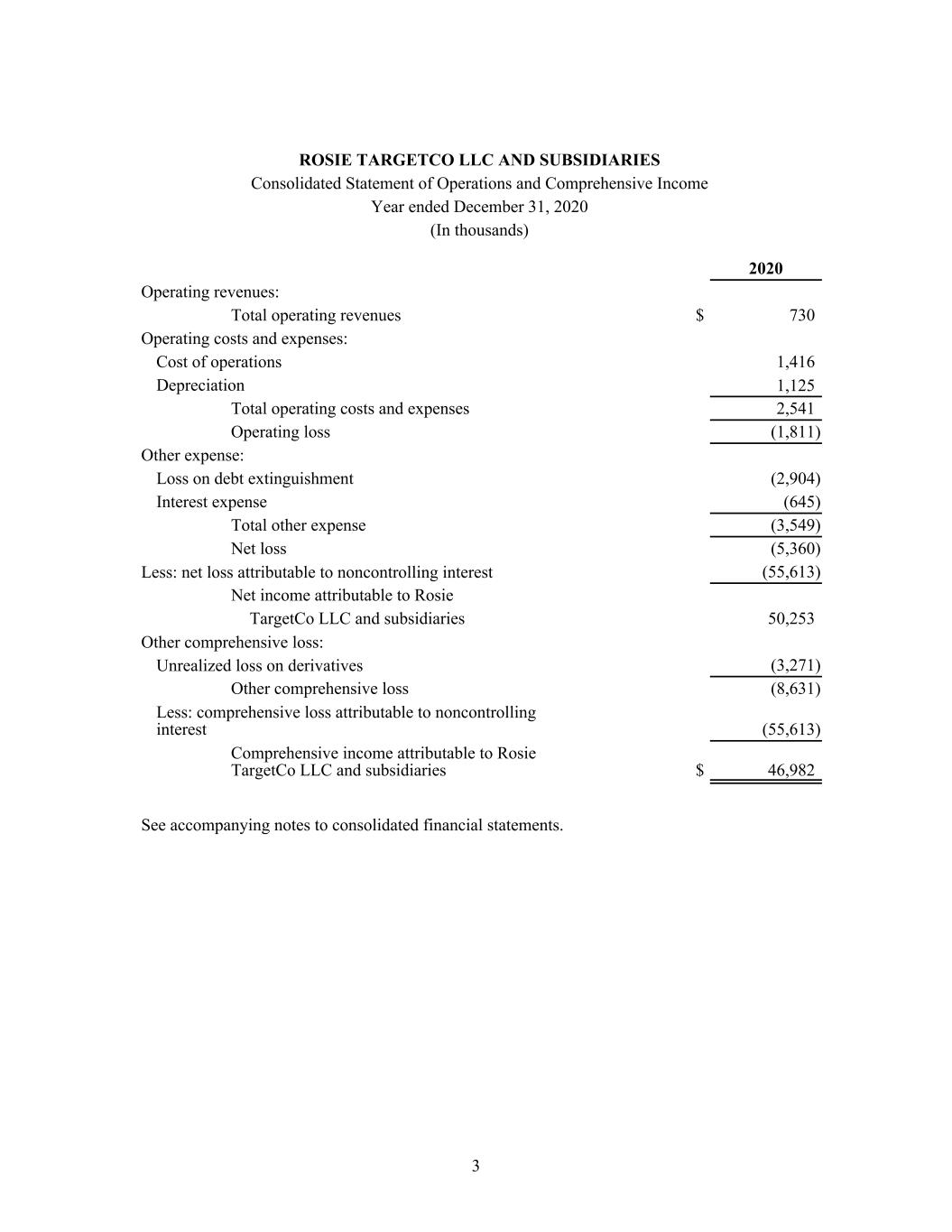 ROSIE TARGETCO LLC AND SUBSIDIARIES Consolidated Statement of Operations and Comprehensive Income Year ended December 31, 2020 (In thousands) 2020 Operating revenues: Total operating revenues $ 730 Operating costs and expenses: Cost of operations 1,416 Depreciation 1,125 Total operating costs and expenses 2,541 Operating loss (1,811) Other expense: Loss on debt extinguishment (2,904) Interest expense (645) Total other expense (3,549) Net loss (5,360) Less: net loss attributable to noncontrolling interest (55,613) Net income attributable to Rosie TargetCo LLC and subsidiaries 50,253 Other comprehensive loss: Unrealized loss on derivatives (3,271) Other comprehensive loss (8,631) Less: comprehensive loss attributable to noncontrolling interest (55,613) Comprehensive income attributable to Rosie TargetCo LLC and subsidiaries $ 46,982 See accompanying notes to consolidated financial statements. 3