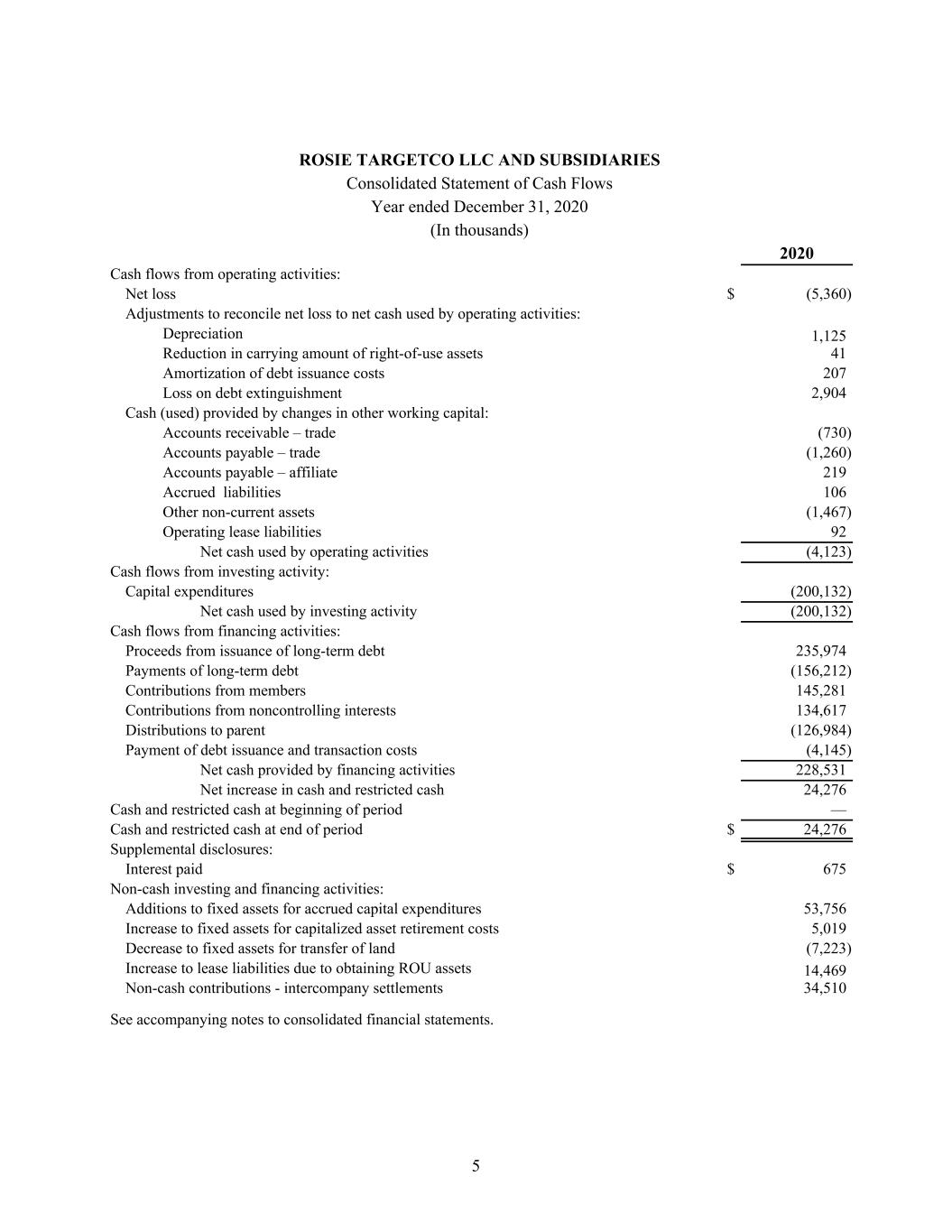 ROSIE TARGETCO LLC AND SUBSIDIARIES Consolidated Statement of Cash Flows Year ended December 31, 2020 (In thousands) 2020 Cash flows from operating activities: Net loss $ (5,360) Adjustments to reconcile net loss to net cash used by operating activities: Depreciation 1,125 Reduction in carrying amount of right-of-use assets 41 Amortization of debt issuance costs 207 Loss on debt extinguishment 2,904 Cash (used) provided by changes in other working capital: Accounts receivable – trade (730) Accounts payable – trade (1,260) Accounts payable – affiliate 219 Accrued liabilities 106 Other non-current assets (1,467) Operating lease liabilities 92 Net cash used by operating activities (4,123) Cash flows from investing activity: Capital expenditures (200,132) Net cash used by investing activity (200,132) Cash flows from financing activities: Proceeds from issuance of long-term debt 235,974 Payments of long-term debt (156,212) Contributions from members 145,281 Contributions from noncontrolling interests 134,617 Distributions to parent (126,984) Payment of debt issuance and transaction costs (4,145) Net cash provided by financing activities 228,531 Net increase in cash and restricted cash 24,276 Cash and restricted cash at beginning of period — Cash and restricted cash at end of period $ 24,276 Supplemental disclosures: Interest paid $ 675 Non-cash investing and financing activities: Additions to fixed assets for accrued capital expenditures 53,756 Increase to fixed assets for capitalized asset retirement costs 5,019 Decrease to fixed assets for transfer of land (7,223) Increase to lease liabilities due to obtaining ROU assets 14,469 Non-cash contributions - intercompany settlements 34,510 See accompanying notes to consolidated financial statements. 5