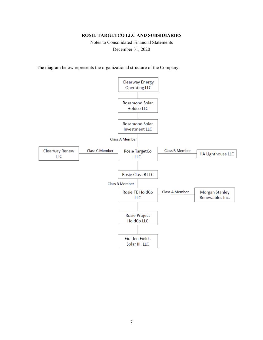 (1) Nature of Business Rosie TargetCo LLC and subsidiaries, or the Company, a Delaware limited liability company, owns 100% of Rosie Class B LLC, or Rosie Class B, a Delaware limited liability company. Rosie Class B owns 100% of the Class B membership interests of Rosie TE HoldCo LLC or Rosie TE HoldCo. A third party investor, Morgan Stanley Renewables Inc., or Morgan Stanley, owns 100% of the Class A membership interests of Rosie TE HoldCo. Rosie TE HoldCo owns 100% of Rosie Project HoldCo LLC, or Rosie Project HoldCo, which directly owns 100% of Golden Fields Solar III, LLC, or Golden Fields Solar III. Golden Fields Solar III owns a 192-megawatt, or MW, photovoltaic solar generating facility located in Kern County, California, known as the Facility. The Company was formed as the indirect owner of Rosie DevCo LLC, and the owner of Rosie Class B and Rosie Project HoldCo, for the purposes of developing, financing, and constructing the Facility. The Facility achieved 100% commercial operations, or COD, on December 22, 2020. Prior to the acquisition, Rosie DevCo LLC was transferred to a subsidiary of Clearway Renew LLC, or Clearway Renew, and on November 20, 2020, Rosie TE HoldCo acquired Rosie Project HoldCo from Rosie DevCo LLC. The Company is a limited liability company, whose Class A membership interests are owned by Clearway Energy Operating LLC, through its indirect subsidiary Rosamond Solar Investment LLC, or Rosamond Solar Investment. Clearway Energy Operating LLC acquired its interest in the Company on December 21, 2020. Clearway Energy Operating LLC, is a wholly owned subsidiary of Clearway Energy LLC, which is owned by Clearway Energy, Inc. and Clearway Energy Group LLC, or Clearway Energy Group. The Company’s Class B membership interests are owned by HA Lighthouse LLC, or HASI. HASI acquired its interest on November 20, 2020 for cash consideration of $61.9 million. Prior to these ownership changes, the Company’s Class A and Class B membership interests were owned by Clearway Renew, a wholly owned subsidiary of Clearway Energy Group. Clearway Energy Group is a wholly owned subsidiary of Global Infrastructure Partners III. Clearway Renew retains the Class C membership interests in the Company, which are not participating interests and provide for the potential future allocation of cash in the event of excess returns on investment to HASI. The Company is governed by an Amended and Restated Limited Liability Company Agreement, or LLCA, which is further described below. As of December 31, 2020, Clearway Energy, Inc., through its ownership of Class A and Class C common stock, had a 57.61% economic interest in Clearway Energy LLC, while Clearway Energy Group, through its ownership of Class B and Class D common stock, had a 54.93% voting interest in Clearway Energy, Inc. and a 42.39% economic interest in Clearway Energy LLC. ROSIE TARGETCO LLC AND SUBSIDIARIES Notes to Consolidated Financial Statements December 31, 2020 6
