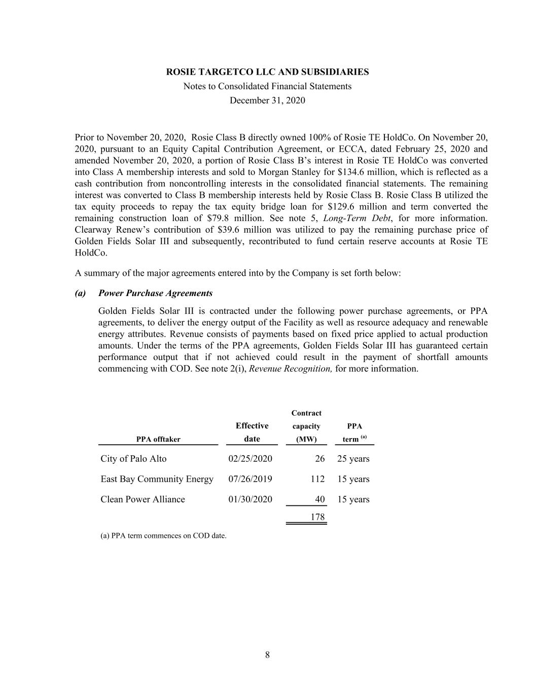 Prior to November 20, 2020, Rosie Class B directly owned 100% of Rosie TE HoldCo. On November 20, 2020, pursuant to an Equity Capital Contribution Agreement, or ECCA, dated February 25, 2020 and amended November 20, 2020, a portion of Rosie Class B’s interest in Rosie TE HoldCo was converted into Class A membership interests and sold to Morgan Stanley for $134.6 million, which is reflected as a cash contribution from noncontrolling interests in the consolidated financial statements. The remaining interest was converted to Class B membership interests held by Rosie Class B. Rosie Class B utilized the tax equity proceeds to repay the tax equity bridge loan for $129.6 million and term converted the remaining construction loan of $79.8 million. See note 5, Long-Term Debt, for more information. Clearway Renew’s contribution of $39.6 million was utilized to pay the remaining purchase price of Golden Fields Solar III and subsequently, recontributed to fund certain reserve accounts at Rosie TE HoldCo. A summary of the major agreements entered into by the Company is set forth below: (a) Power Purchase Agreements Golden Fields Solar III is contracted under the following power purchase agreements, or PPA agreements, to deliver the energy output of the Facility as well as resource adequacy and renewable energy attributes. Revenue consists of payments based on fixed price applied to actual production amounts. Under the terms of the PPA agreements, Golden Fields Solar III has guaranteed certain performance output that if not achieved could result in the payment of shortfall amounts commencing with COD. See note 2(i), Revenue Recognition, for more information. Contract Effective capacity PPA PPA offtaker date (MW) term (a) City of Palo Alto 02/25/2020 26 25 years East Bay Community Energy 07/26/2019 112 15 years Clean Power Alliance 01/30/2020 40 15 years 178 (a) PPA term commences on COD date. ROSIE TARGETCO LLC AND SUBSIDIARIES Notes to Consolidated Financial Statements December 31, 2020 8