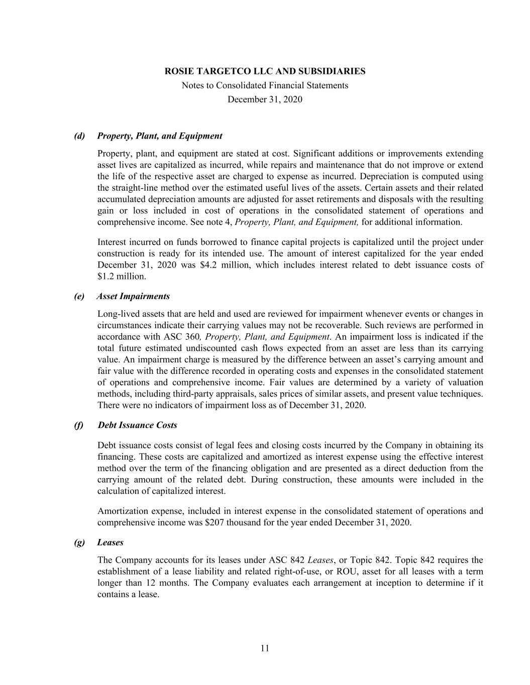 (d) Property, Plant, and Equipment Property, plant, and equipment are stated at cost. Significant additions or improvements extending asset lives are capitalized as incurred, while repairs and maintenance that do not improve or extend the life of the respective asset are charged to expense as incurred. Depreciation is computed using the straight-line method over the estimated useful lives of the assets. Certain assets and their related accumulated depreciation amounts are adjusted for asset retirements and disposals with the resulting gain or loss included in cost of operations in the consolidated statement of operations and comprehensive income. See note 4, Property, Plant, and Equipment, for additional information. Interest incurred on funds borrowed to finance capital projects is capitalized until the project under construction is ready for its intended use. The amount of interest capitalized for the year ended December 31, 2020 was $4.2 million, which includes interest related to debt issuance costs of $1.2 million. (e) Asset Impairments Long-lived assets that are held and used are reviewed for impairment whenever events or changes in circumstances indicate their carrying values may not be recoverable. Such reviews are performed in accordance with ASC 360, Property, Plant, and Equipment. An impairment loss is indicated if the total future estimated undiscounted cash flows expected from an asset are less than its carrying value. An impairment charge is measured by the difference between an asset’s carrying amount and fair value with the difference recorded in operating costs and expenses in the consolidated statement of operations and comprehensive income. Fair values are determined by a variety of valuation methods, including third-party appraisals, sales prices of similar assets, and present value techniques. There were no indicators of impairment loss as of December 31, 2020. (f) Debt Issuance Costs Debt issuance costs consist of legal fees and closing costs incurred by the Company in obtaining its financing. These costs are capitalized and amortized as interest expense using the effective interest method over the term of the financing obligation and are presented as a direct deduction from the carrying amount of the related debt. During construction, these amounts were included in the calculation of capitalized interest. Amortization expense, included in interest expense in the consolidated statement of operations and comprehensive income was $207 thousand for the year ended December 31, 2020. (g) Leases The Company accounts for its leases under ASC 842 Leases, or Topic 842. Topic 842 requires the establishment of a lease liability and related right-of-use, or ROU, asset for all leases with a term longer than 12 months. The Company evaluates each arrangement at inception to determine if it contains a lease. ROSIE TARGETCO LLC AND SUBSIDIARIES Notes to Consolidated Financial Statements December 31, 2020 11