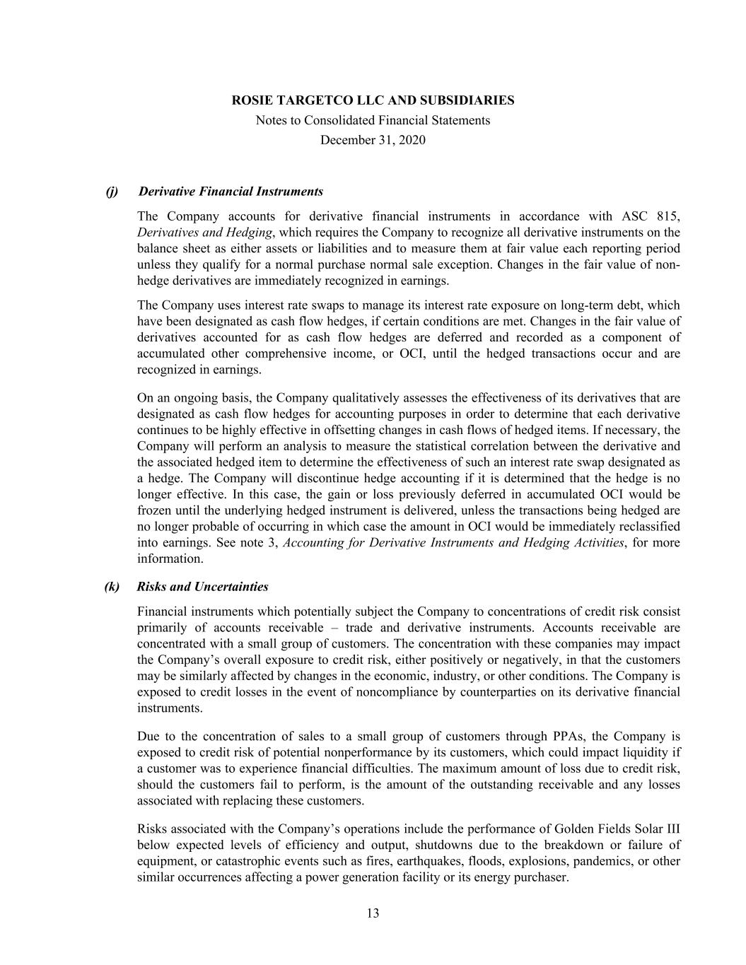 (j) Derivative Financial Instruments The Company accounts for derivative financial instruments in accordance with ASC 815, Derivatives and Hedging, which requires the Company to recognize all derivative instruments on the balance sheet as either assets or liabilities and to measure them at fair value each reporting period unless they qualify for a normal purchase normal sale exception. Changes in the fair value of non- hedge derivatives are immediately recognized in earnings. The Company uses interest rate swaps to manage its interest rate exposure on long-term debt, which have been designated as cash flow hedges, if certain conditions are met. Changes in the fair value of derivatives accounted for as cash flow hedges are deferred and recorded as a component of accumulated other comprehensive income, or OCI, until the hedged transactions occur and are recognized in earnings. On an ongoing basis, the Company qualitatively assesses the effectiveness of its derivatives that are designated as cash flow hedges for accounting purposes in order to determine that each derivative continues to be highly effective in offsetting changes in cash flows of hedged items. If necessary, the Company will perform an analysis to measure the statistical correlation between the derivative and the associated hedged item to determine the effectiveness of such an interest rate swap designated as a hedge. The Company will discontinue hedge accounting if it is determined that the hedge is no longer effective. In this case, the gain or loss previously deferred in accumulated OCI would be frozen until the underlying hedged instrument is delivered, unless the transactions being hedged are no longer probable of occurring in which case the amount in OCI would be immediately reclassified into earnings. See note 3, Accounting for Derivative Instruments and Hedging Activities, for more information. (k) Risks and Uncertainties Financial instruments which potentially subject the Company to concentrations of credit risk consist primarily of accounts receivable – trade and derivative instruments. Accounts receivable are concentrated with a small group of customers. The concentration with these companies may impact the Company’s overall exposure to credit risk, either positively or negatively, in that the customers may be similarly affected by changes in the economic, industry, or other conditions. The Company is exposed to credit losses in the event of noncompliance by counterparties on its derivative financial instruments. Due to the concentration of sales to a small group of customers through PPAs, the Company is exposed to credit risk of potential nonperformance by its customers, which could impact liquidity if a customer was to experience financial difficulties. The maximum amount of loss due to credit risk, should the customers fail to perform, is the amount of the outstanding receivable and any losses associated with replacing these customers. Risks associated with the Company’s operations include the performance of Golden Fields Solar III below expected levels of efficiency and output, shutdowns due to the breakdown or failure of equipment, or catastrophic events such as fires, earthquakes, floods, explosions, pandemics, or other similar occurrences affecting a power generation facility or its energy purchaser. ROSIE TARGETCO LLC AND SUBSIDIARIES Notes to Consolidated Financial Statements December 31, 2020 13