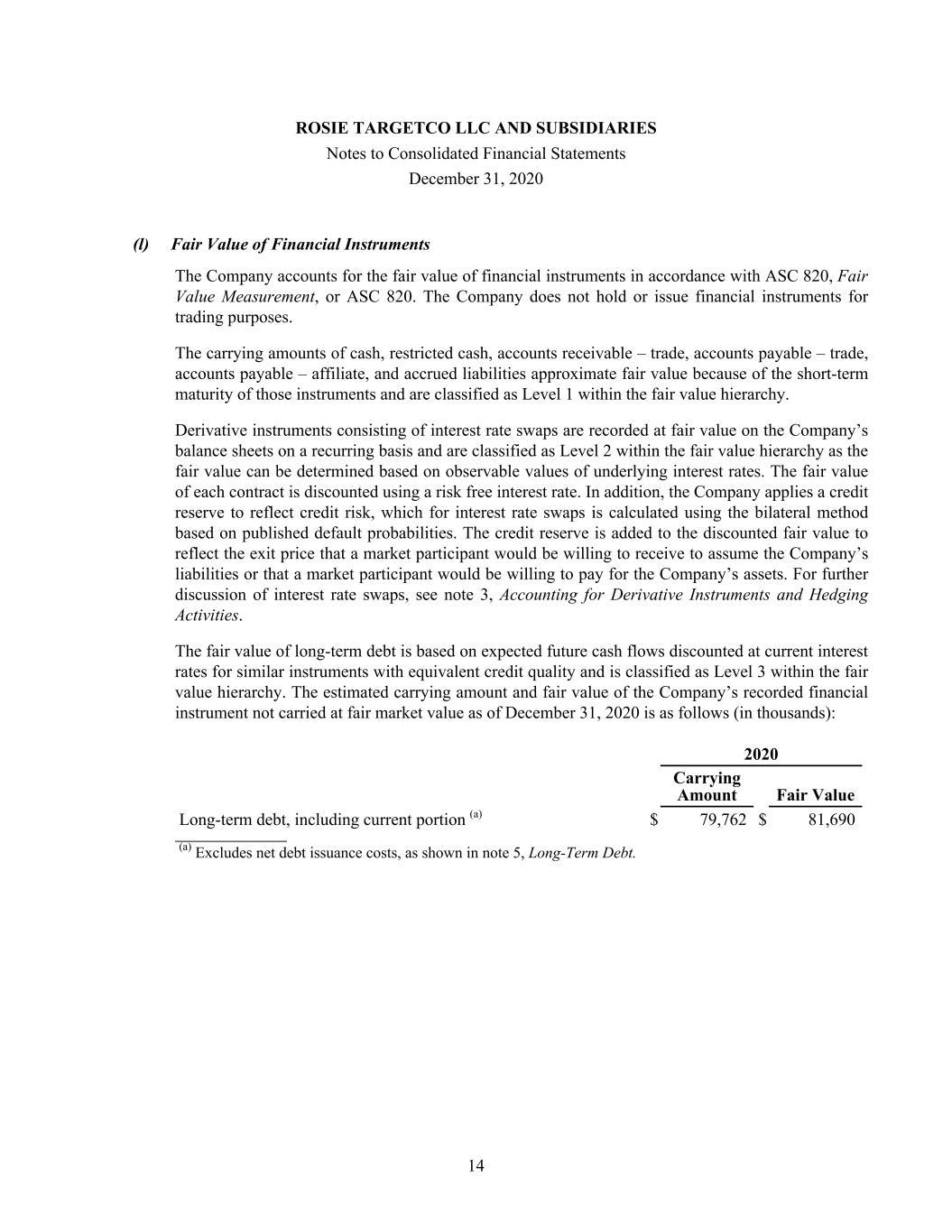 (l) Fair Value of Financial Instruments The Company accounts for the fair value of financial instruments in accordance with ASC 820, Fair Value Measurement, or ASC 820. The Company does not hold or issue financial instruments for trading purposes. The carrying amounts of cash, restricted cash, accounts receivable – trade, accounts payable – trade, accounts payable – affiliate, and accrued liabilities approximate fair value because of the short-term maturity of those instruments and are classified as Level 1 within the fair value hierarchy. Derivative instruments consisting of interest rate swaps are recorded at fair value on the Company’s balance sheets on a recurring basis and are classified as Level 2 within the fair value hierarchy as the fair value can be determined based on observable values of underlying interest rates. The fair value of each contract is discounted using a risk free interest rate. In addition, the Company applies a credit reserve to reflect credit risk, which for interest rate swaps is calculated using the bilateral method based on published default probabilities. The credit reserve is added to the discounted fair value to reflect the exit price that a market participant would be willing to receive to assume the Company’s liabilities or that a market participant would be willing to pay for the Company’s assets. For further discussion of interest rate swaps, see note 3, Accounting for Derivative Instruments and Hedging Activities. The fair value of long-term debt is based on expected future cash flows discounted at current interest rates for similar instruments with equivalent credit quality and is classified as Level 3 within the fair value hierarchy. The estimated carrying amount and fair value of the Company’s recorded financial instrument not carried at fair market value as of December 31, 2020 is as follows (in thousands): 2020 Carrying Amount Fair Value Long-term debt, including current portion (a) $ 79,762 $ 81,690 (a) Excludes net debt issuance costs, as shown in note 5, Long-Term Debt. ROSIE TARGETCO LLC AND SUBSIDIARIES Notes to Consolidated Financial Statements December 31, 2020 14