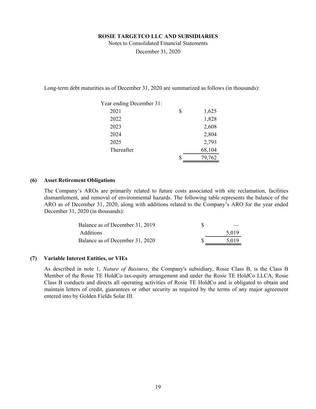 Long-term debt maturities as of December 31, 2020 are summarized as follows (in thousands): Year ending December 31: 2021 $ 1,625 2022 1,828 2023 2,608 2024 2,804 2025 2,793 Thereafter 68,104 $ 79,762 (6) Asset Retirement Obligations The Company’s AROs are primarily related to future costs associated with site reclamation, facilities dismantlement, and removal of environmental hazards. The following table represents the balance of the ARO as of December 31, 2020, along with additions related to the Company’s ARO for the year ended December 31, 2020 (in thousands): Balance as of December 31, 2019 $ — Additions 5,019 Balance as of December 31, 2020 $ 5,019 (7) Variable Interest Entities, or VIEs As described in note 1, Nature of Business, the Company's subsidiary, Rosie Class B, is the Class B Member of the Rosie TE HoldCo tax-equity arrangement and under the Rosie TE HoldCo LLCA, Rosie Class B conducts and directs all operating activities of Rosie TE HoldCo and is obligated to obtain and maintain letters of credit, guarantees or other security as required by the terms of any major agreement entered into by Golden Fields Solar III. ROSIE TARGETCO LLC AND SUBSIDIARIES Notes to Consolidated Financial Statements December 31, 2020 19