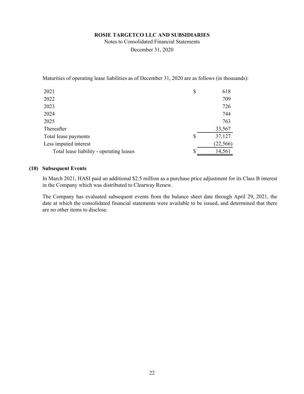 Maturities of operating lease liabilities as of December 31, 2020 are as follows (in thousands): 2021 $ 618 2022 709 2023 726 2024 744 2025 763 Thereafter 33,567 Total lease payments $ 37,127 Less imputed interest (22,566) Total lease liability - operating leases $ 14,561 (10) Subsequent Events In March 2021, HASI paid an additional $2.5 million as a purchase price adjustment for its Class B interest in the Company which was distributed to Clearway Renew. The Company has evaluated subsequent events from the balance sheet date through April 29, 2021, the date at which the consolidated financial statements were available to be issued, and determined that there are no other items to disclose. ROSIE TARGETCO LLC AND SUBSIDIARIES Notes to Consolidated Financial Statements December 31, 2020 22