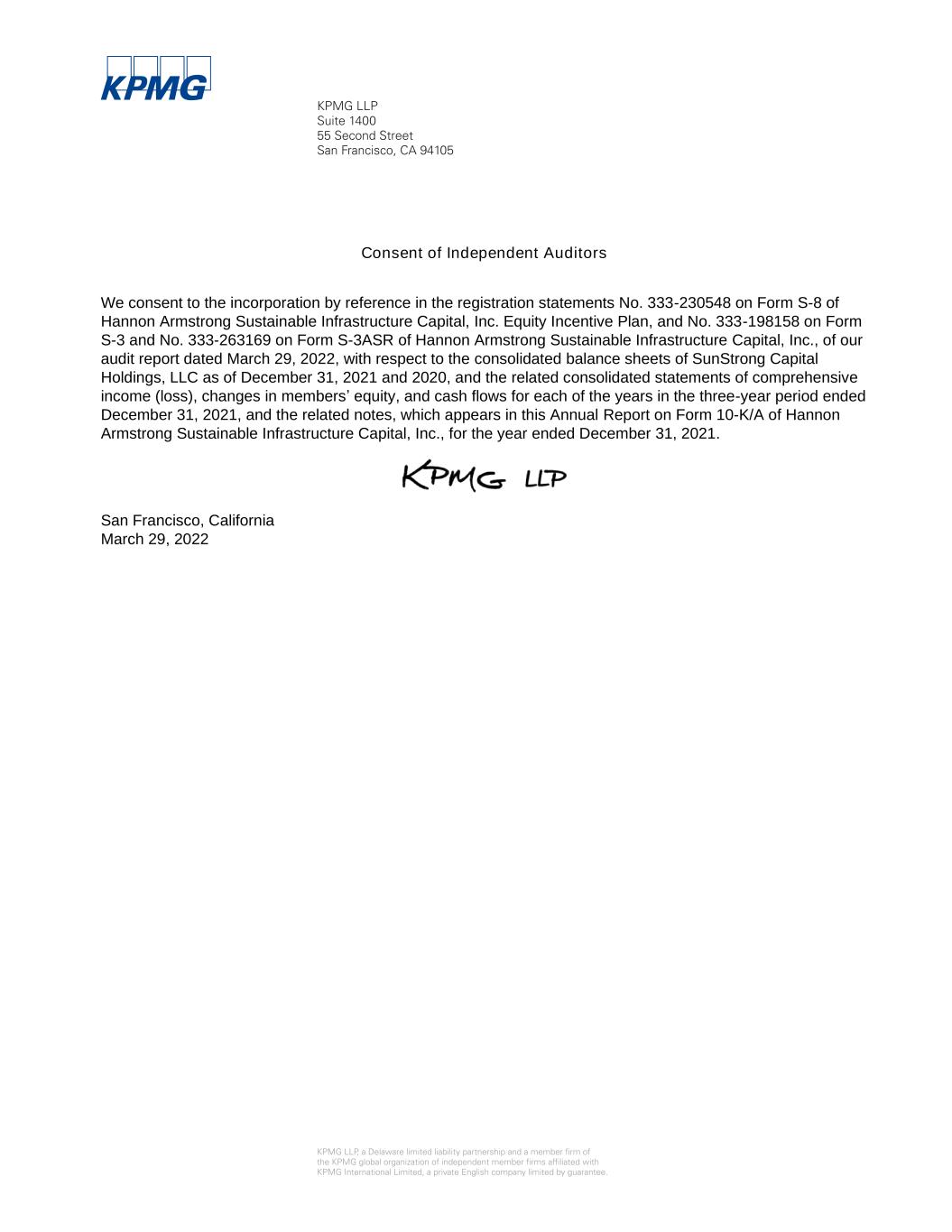 KPMG LLP Suite 1400 55 Second Street San Francisco, CA 94105 KPMG LLP, a Delaware limited liability partnership and a member firm of the KPMG global organization of independent member firms affiliated with KPMG International Limited, a private English company limited by guarantee. Consent of Independent Auditors We consent to the incorporation by reference in the registration statements No. 333-230548 on Form S-8 of Hannon Armstrong Sustainable Infrastructure Capital, Inc. Equity Incentive Plan, and No. 333-198158 on Form S-3 and No. 333-263169 on Form S-3ASR of Hannon Armstrong Sustainable Infrastructure Capital, Inc., of our audit report dated March 29, 2022, with respect to the consolidated balance sheets of SunStrong Capital Holdings, LLC as of December 31, 2021 and 2020, and the related consolidated statements of comprehensive income (loss), changes in members’ equity, and cash flows for each of the years in the three-year period ended December 31, 2021, and the related notes, which appears in this Annual Report on Form 10-K/A of Hannon Armstrong Sustainable Infrastructure Capital, Inc., for the year ended December 31, 2021. San Francisco, California March 29, 2022