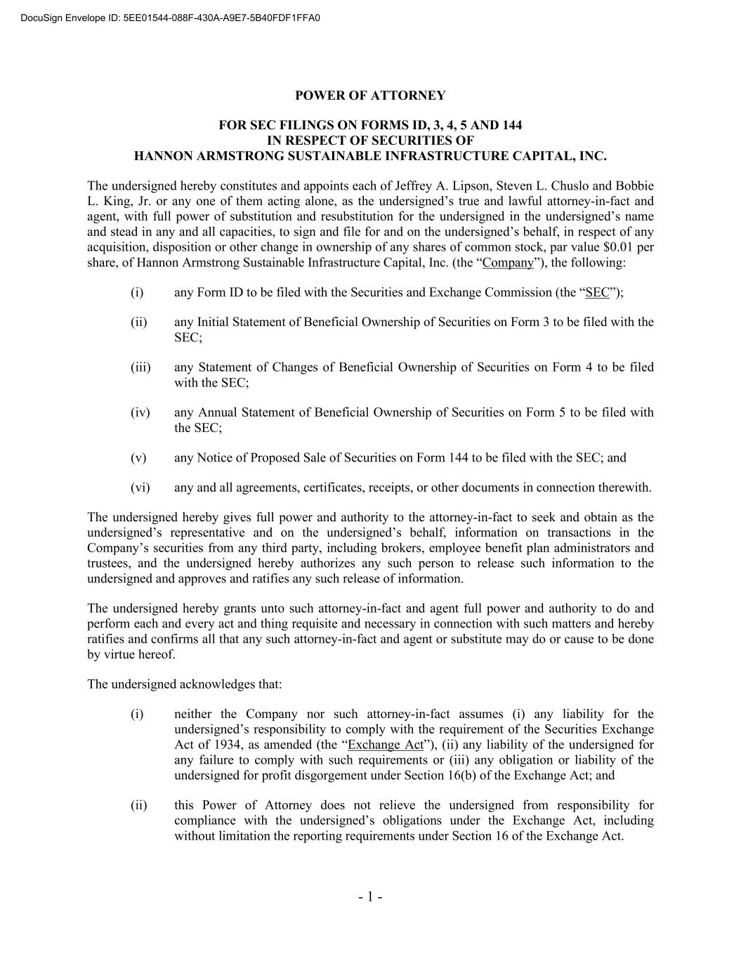 - 1 - POWER OF ATTORNEY FOR SEC FILINGS ON FORMS ID, 3, 4, 5 AND 144 IN RESPECT OF SECURITIES OF HANNON ARMSTRONG SUSTAINABLE INFRASTRUCTURE CAPITAL, INC. The undersigned hereby constitutes and appoints each of Jeffrey A. Lipson, Steven L. Chuslo and Bobbie L. King, Jr. or any one of them acting alone, as the undersigned’s true and lawful attorney-in-fact and agent, with full power of substitution and resubstitution for the undersigned in the undersigned’s name and stead in any and all capacities, to sign and file for and on the undersigned’s behalf, in respect of any acquisition, disposition or other change in ownership of any shares of common stock, par value $0.01 per share, of Hannon Armstrong Sustainable Infrastructure Capital, Inc. (the “Company”), the following: (i) any Form ID to be filed with the Securities and Exchange Commission (the “SEC”); (ii) any Initial Statement of Beneficial Ownership of Securities on Form 3 to be filed with the SEC; (iii) any Statement of Changes of Beneficial Ownership of Securities on Form 4 to be filed with the SEC; (iv) any Annual Statement of Beneficial Ownership of Securities on Form 5 to be filed with the SEC; (v) any Notice of Proposed Sale of Securities on Form 144 to be filed with the SEC; and (vi) any and all agreements, certificates, receipts, or other documents in connection therewith. The undersigned hereby gives full power and authority to the attorney-in-fact to seek and obtain as the undersigned’s representative and on the undersigned’s behalf, information on transactions in the Company’s securities from any third party, including brokers, employee benefit plan administrators and trustees, and the undersigned hereby authorizes any such person to release such information to the undersigned and approves and ratifies any such release of information. The undersigned hereby grants unto such attorney-in-fact and agent full power and authority to do and perform each and every act and thing requisite and necessary in connection with such matters and hereby ratifies and confirms all that any such attorney-in-fact and agent or substitute may do or cause to be done by virtue hereof. The undersigned acknowledges that: (i) neither the Company nor such attorney-in-fact assumes (i) any liability for the undersigned’s responsibility to comply with the requirement of the Securities Exchange Act of 1934, as amended (the “Exchange Act”), (ii) any liability of the undersigned for any failure to comply with such requirements or (iii) any obligation or liability of the undersigned for profit disgorgement under Section 16(b) of the Exchange Act; and (ii) this Power of Attorney does not relieve the undersigned from responsibility for compliance with the undersigned’s obligations under the Exchange Act, including without limitation the reporting requirements under Section 16 of the Exchange Act. DocuSign Envelope ID: 5EE01544-088F-430A-A9E7-5B40FDF1FFA0